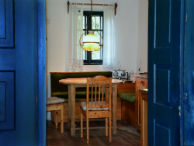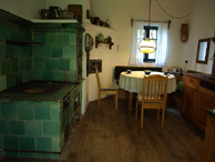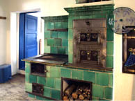 Das in Alleinlage auf einem Hügel liegende Haus ist komfortabel eingerichtet und ideal für zwei Personen. In der Wohnküche dominiert ein alter grüner Kachelherd neben der Einbauküche aus Holz - komplett ausgestattet mit Geschirr und Küchengeräten, Ceran-Herdplatte und Geschirrspüler.
