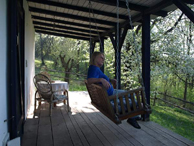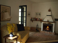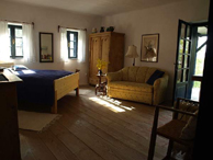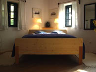 Im großen hellen Wohn-Schlafzimmer verbreiten der alte Holzboden und das gemütliche Sofa eine behagliche Atmosphäre. SAT-TV, DVD-Player, freies Internet WLAN sind vorhanden. Vom Wohnraum gelangen Sie auf die überdachte große Holzterrasse mit herrlichem Fernblick. Das holzverkleidete Badezimmer (Badewanne mit Dusche und Schlauchdusche, Waschmaschine) mit Blick ins Grüne ist vom Arkadengang begehbar. Hand- und Badetücher sowie ein Bademantel liegen für Sie bereit.